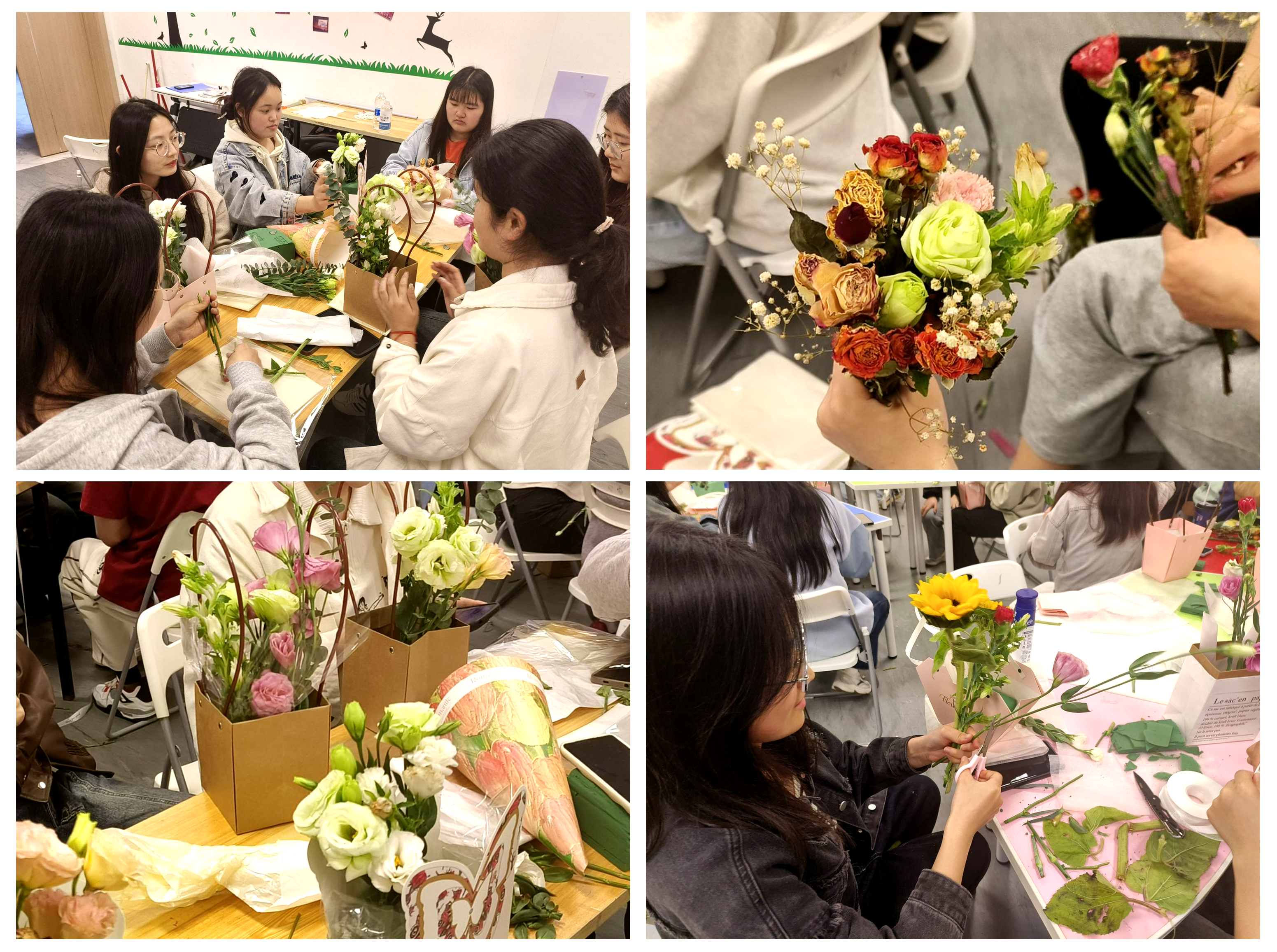活动现场,同学们选取自己心仪的花卉,结合插花技巧提示,相互讨论插花工艺、插花形式及色调搭配,并根据自己的创意将花束包装成了心仪的造型送给自己。各式各样的鲜花经过同学们的修剪、组合和自我创造,成为了一件件错落有致、富有创意的艺术品。活动结束,同学们把自己新手制作的花束送给自己,有的放在书桌前,有的挂在门后,装扮寝室,“点亮”心情。22广告1班的王子闰同学兴奋地表示:“看着自己亲手创作的花艺作品,不仅觉得它特别美,也体会到劳动乐趣,平添了一份自信。我相信一看到自己制作的花儿,就会有了好心情。”