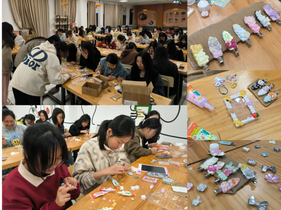 作为当下备受年轻人欢迎的手工制作,本次活动也激发了同学们的无限热情。大家发挥想象力,用马卡龙般绚烂的奶油胶,将自己喜欢的小配件均匀地粘黏在相框、手机壳、发夹等工艺品上。活动过程中,有人胸有成竹,果断地布局以及定型;有人略显犹豫,思考片刻后不断观察着身边人的进度。作品展示环节,大家通过细腻的语言,表达了生活的美好期盼,抒发对友人的珍贵情谊,尽情展示自己的创意。