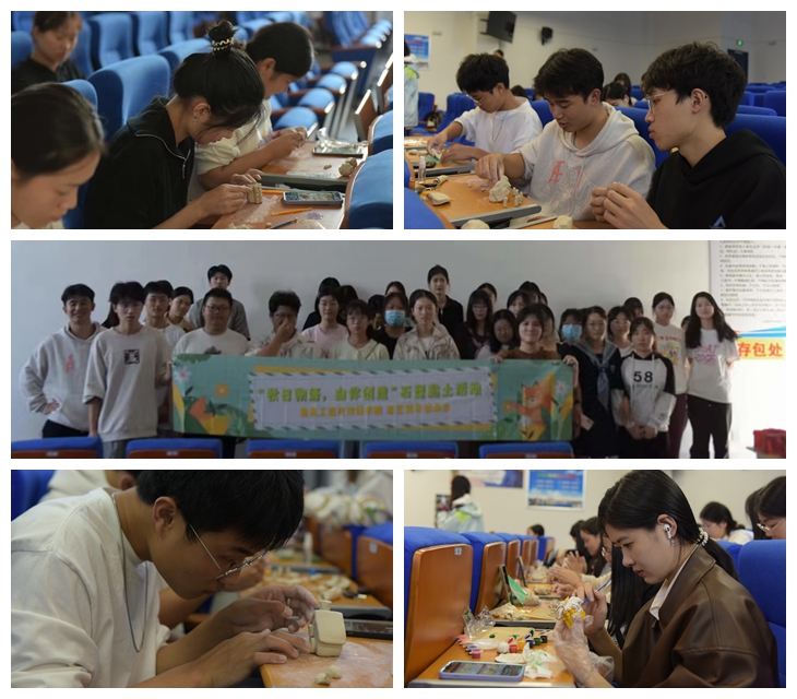 在活动现场作品创作阶段,同学们团结协作,解锁了黏土创作的新技能,在黏土造型设计上纷纷开动脑筋、奇思妙想,交流彼此的创造思路,开启了黏土DIY的快乐时光。通过搓、团、捏、接、压等方式,捏出各式各样的造型来表达自己的内心想法,一件件作品栩栩如生。黏土虽小,创意无限,通过体验黏土创作小游戏,缓解压力、放松身心,培养了同学们的动手力、创造力、专注力,让同学们在繁忙的学习生活中找到返璞归真的童趣,体验着用双手创作带来的舒适与享受。