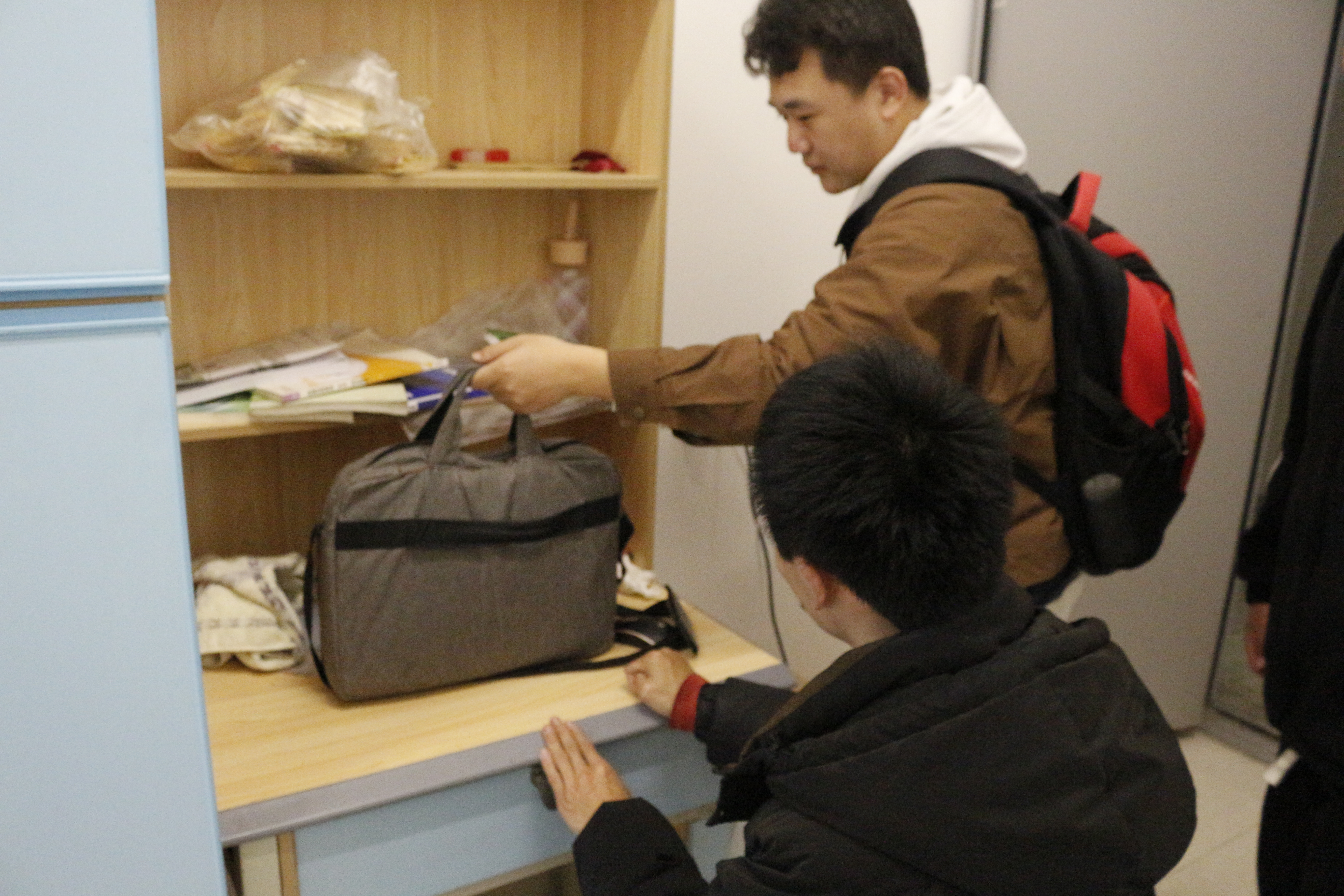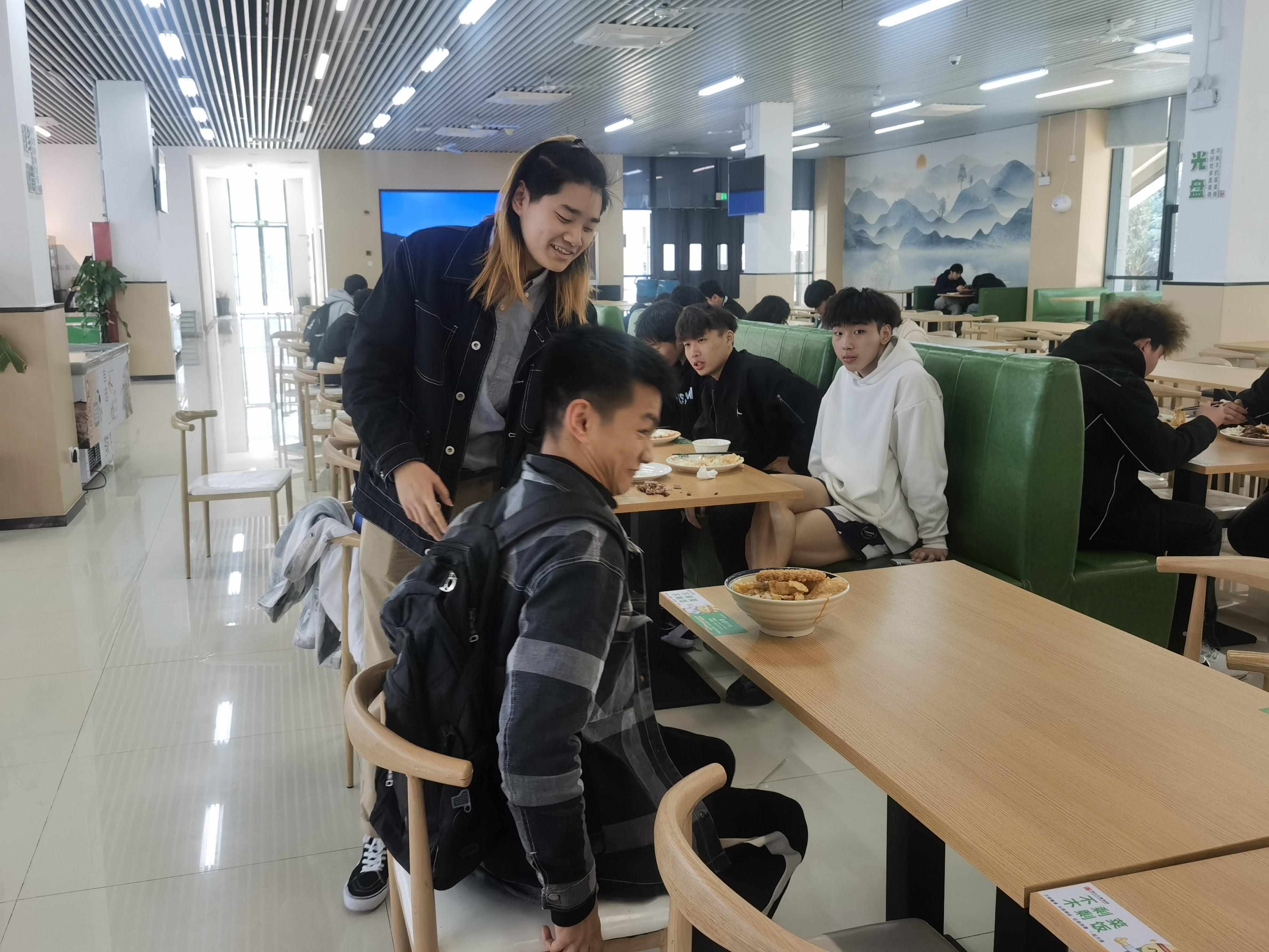 (23物联网工程本科班的沈厚望同学帮助陈克文同学在食堂就餐)