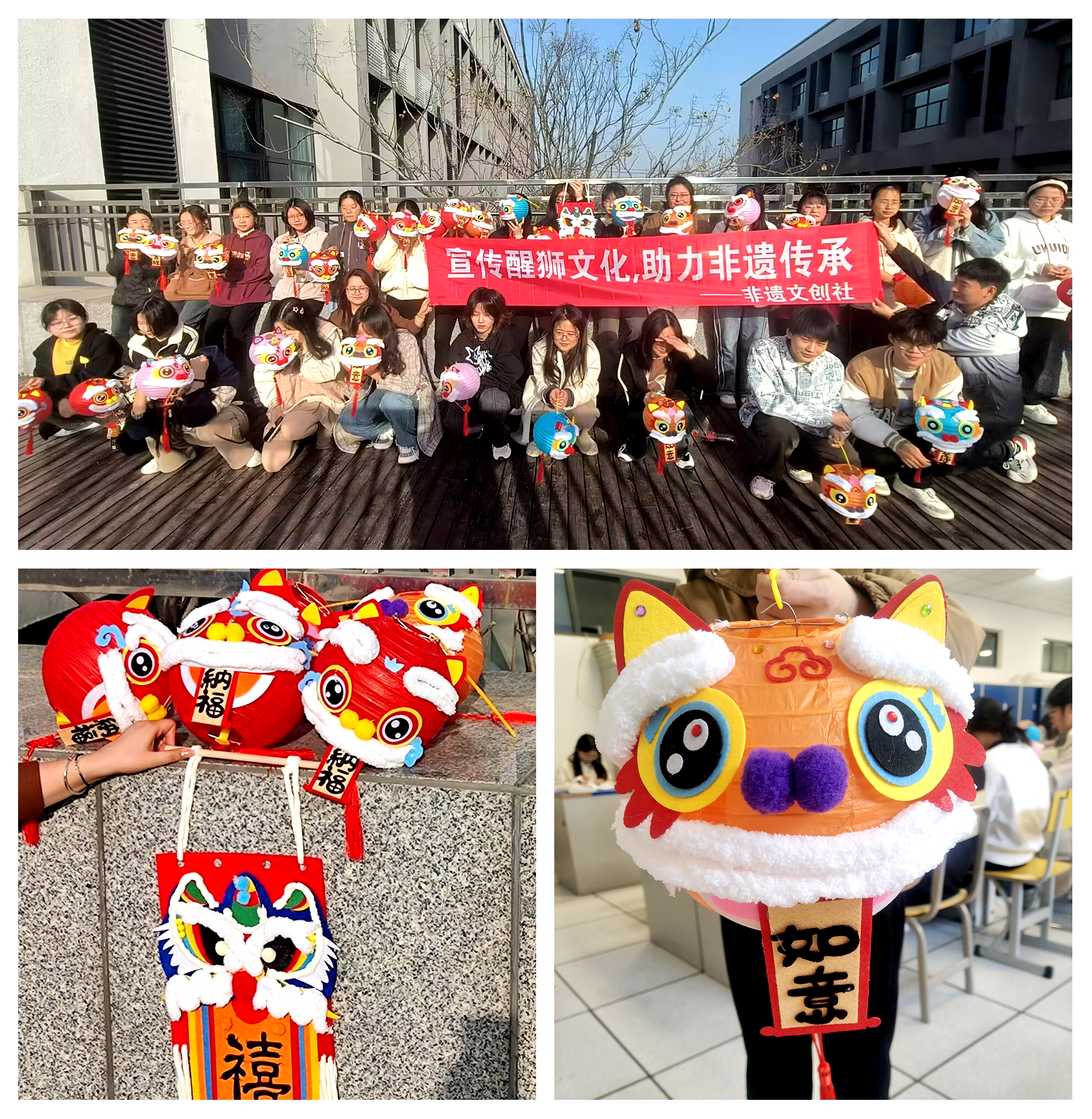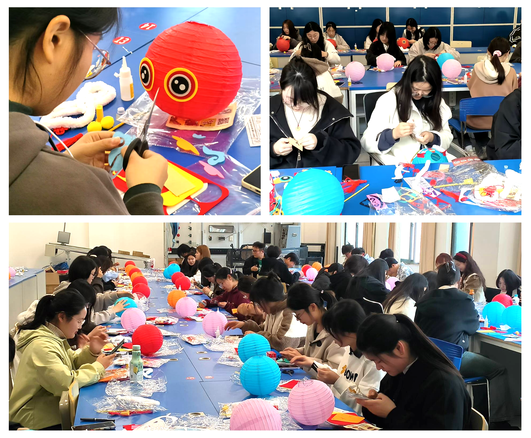 2024年3月20日下午,在信息楼B203教室内,八十多名充满活力的学生正在忙碌着制作一盏盏色彩斑斓的醒狮灯笼。在中国的传统文明中,狮为祥瑞神兽,灯笼则代表着光明、温暖、美好。本次手工活动,不仅让同学们在动手制作中学习中国非遗文化,也展示了学生们对中国传统文化的热爱和传承。