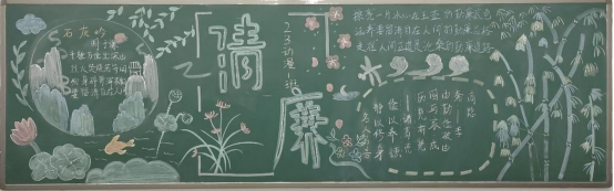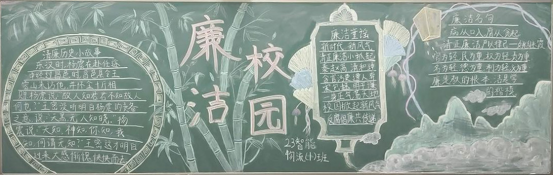 本次黑板报以“崇清尚廉,修身自律”为主题,同时响应党的二十大报告中明确提出的“加强新时代廉洁文化建设”这一重大课题。为强调“清廉”,各班分别用正直挺拔的绿竹和象征廉洁的莲花作为黑板报的背景,并在旁写下“予独爱莲之出淤泥而不染,濯清涟而不妖”这一名句。有的用古人的诗词如诸葛亮的“静以修身,俭以养德”和石灰吟中的“粉身碎骨全不怕,直流清白在人间”来赞扬和呼吁我们养成崇清尚廉的品德。除了借用古诗词外,也有的写下了廉洁警句集锦:“廉洁为官,一身正气”、“廉洁吃亏一阵子,自律安全一辈子”、“廉是清茶,平淡,却是益于身心”...等。还有的将“杨震拒金”的故事写下,以此来警戒同学们。