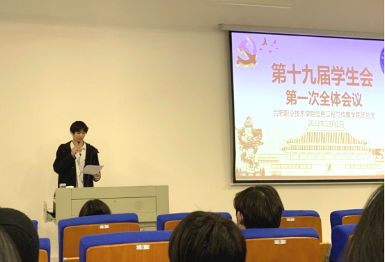 本次会议由信传学院学生会执行主席朱祥祥同学进行主持。会议开始后,首先由朱祥祥同学并进行开幕介绍,团总支副书记圣德菲同学介绍第十九届学生会成员及组织情况;其次,由学生会干部代表,秘书长管俊莹同学进行发言,再由各部门部长介绍,主席团成员介绍;然后由学生会干事代表组织部22计网1班杨昌义同学和体育部22计网2班孔金淼同学进行发言,紧接着各部门干事分别进行自我介绍;最后由主席团代表武家慧同学发言总结。