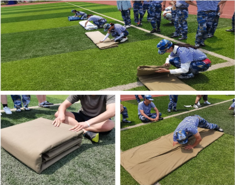 此外,在操场上也开展了叠军被比赛。同学们根据教官的指导,蹲下,铺平、压实、翻折、抠角、捏线,熟练地叠起军被,有的以筷子予以辅助。在短短的几分钟里,同学们的被子都变成了豆腐块,方方正正、整整齐齐,棱角分明。一个个整齐的“豆腐块”呈现在训练场地上,成为军训场上一道亮丽的风景线。经过裁判们的严格评判,20数媒班李迁获得叠军被比赛的第一名。