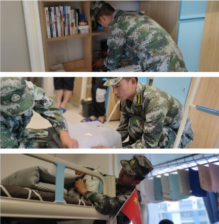 “出门看队伍,进门看内务”,寝室内务整理也是军训的必修课程之一。培养了同学们的良好生活习惯,磨练了同学们的生活自理能力,让同学们感受到了军队纪律的严格,叠军被也是一个考验同学们的项目,它不仅能够提高宿舍整体整洁程度,还有利于学生良好生活习惯的形成,对规范生活习惯起到了促进作用。