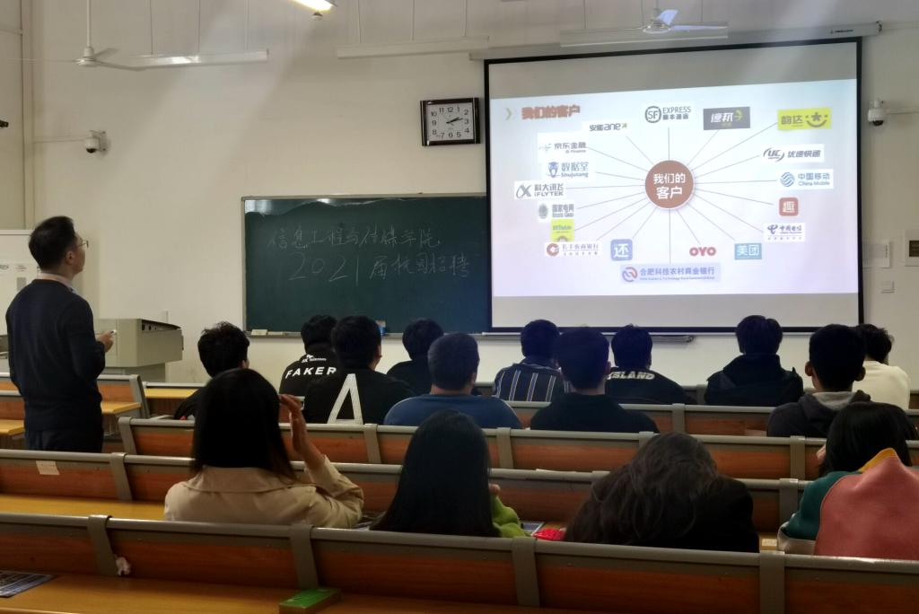2020年11月11日,为切实做好18级电信对口实习就业工作,我院诚邀安徽顺丰速运有限公司、大连金慧融智科技股份有限公司(合肥分公司)等3家对口企业举办校园招聘双选会。为使企业和学生充分沟通交流,分两场分别在信息楼B305和教学南楼111举办企业宣讲,同学们积极参加,现场气氛轻松愉快。
