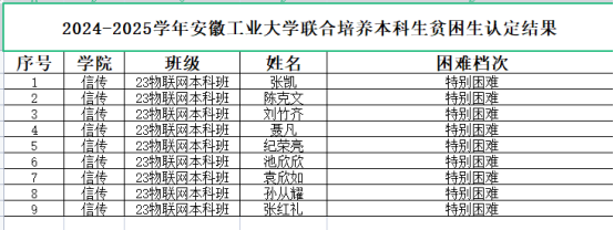 根据《安徽工业大学家庭经济困难学生认定工作实施办法》和《关于认真做好安徽工业大学2024-2025学年家庭经济困难学生认定工作的通知》,遵循公平、公正、公开的原则,在各位同学申请的基础上,经过班级评审小组测评,共有以下几位同学认定为贫困生。