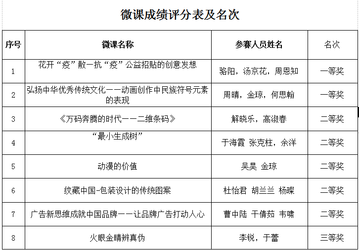 为推动我院教师专业发展和教学能力提升,深入挖掘各类课程和教学方式中蕴含的思想政治教育元素,充分发挥各门课程的思想政治教育功能,全面推动我院课程思政教学改革,我院了举办2021年“课程思政”微课比赛。本次微课比赛共收到作品23个,全部采用线上评审的形式,评审小组成员根据教务处《课程思政微课比赛评分标准》评出分数及等级,现对获奖名单进行公示。